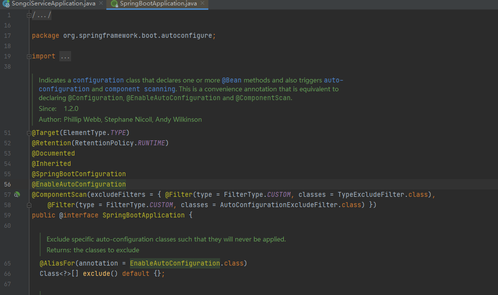 注释说了这是个自动装配扫描器,用这个注解相当于三个注解的集合,@springbootconfiguration @enableautoconfiguration @componentscan