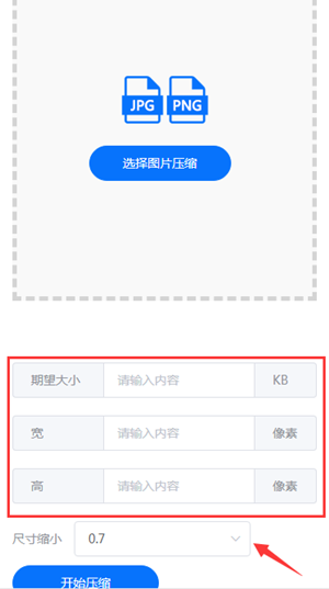 2、点击选择上传图片,输入期望大小值,可以调整图片的宽、高等数值以及整体尺寸缩小,默认图片尺寸缩小0.7,如果不需要修改尺寸设置为1,修改完成后,点击开始压缩。