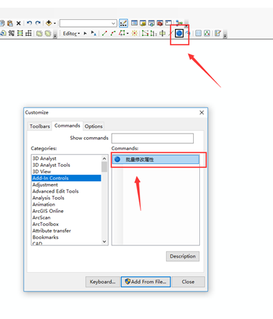 如下图所示,将开发的批量修改属性拖拽到arcgis的工具栏。