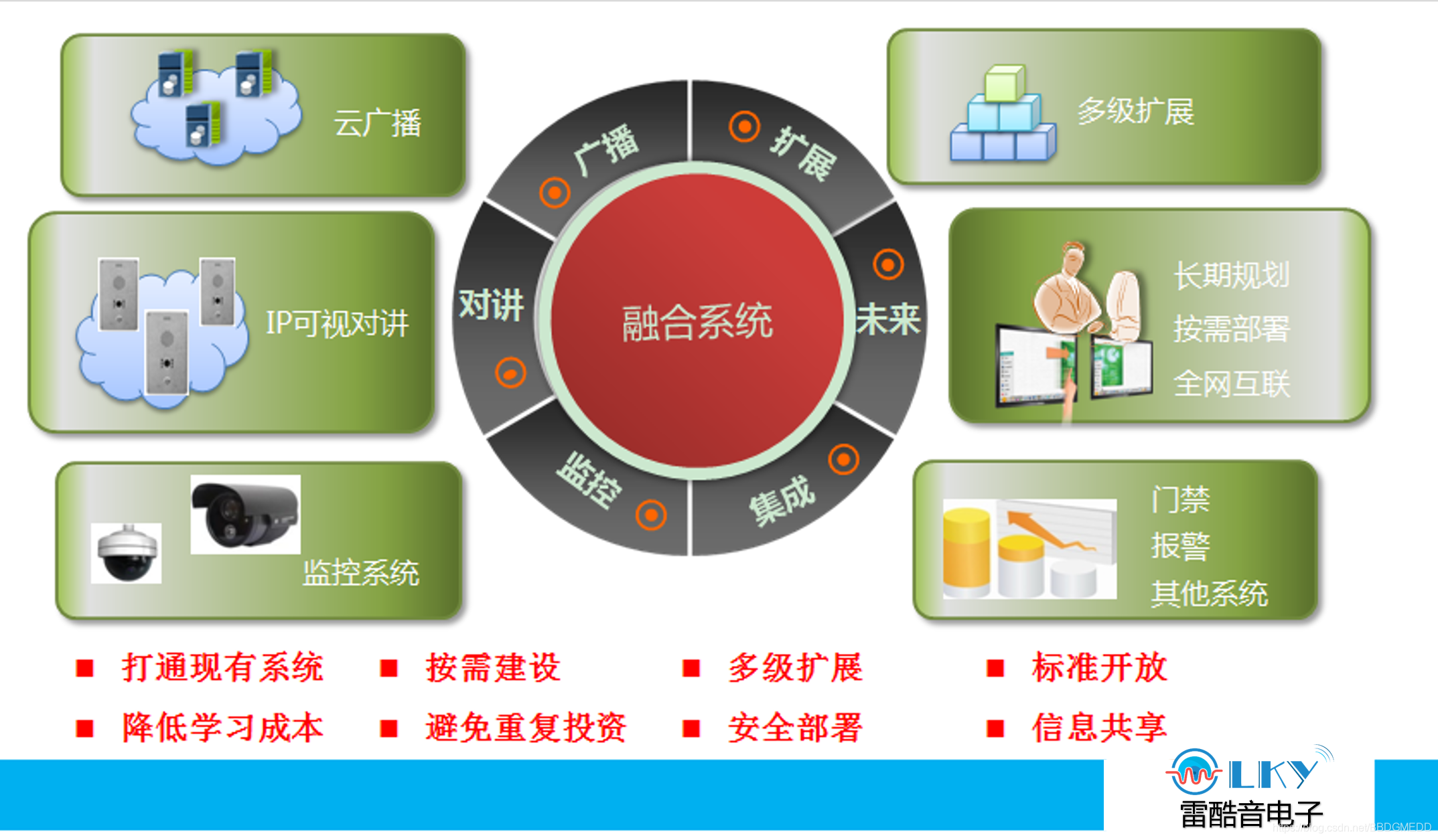 历史的原因,以及建设过程中出现的种种问题,虽然广播、对讲、报警系统离我们很近,也不是什么新课题,但是过去没有产品将他们打通;各个系统在各自的垂直领域也走得比较深入,但是没有人打破各自的界限,那个跨界的系统一直没有出现。此方案的融合系统应运而生,它将以应用创新的姿态带给使用者超预期的价值。