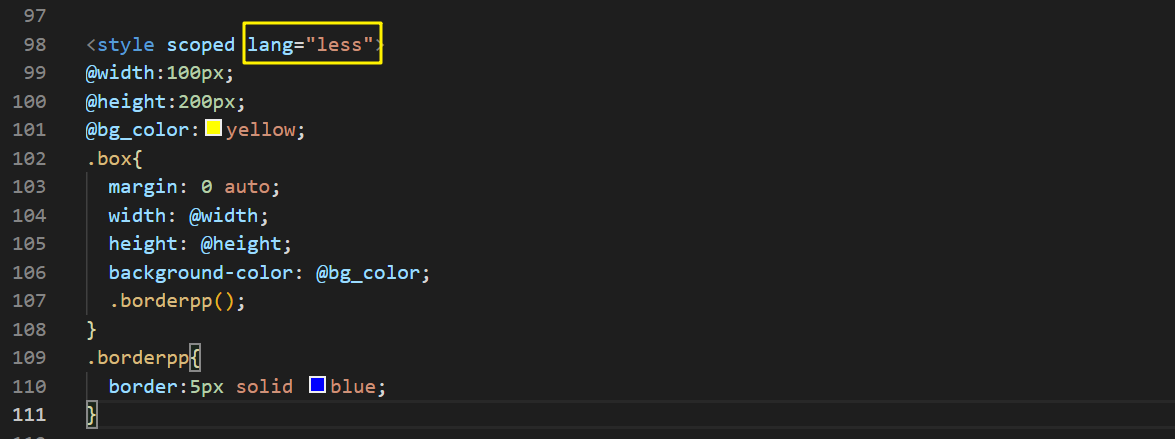 第三步,在代码中的style标签中加上lang="less",就可以使用less编写样式了