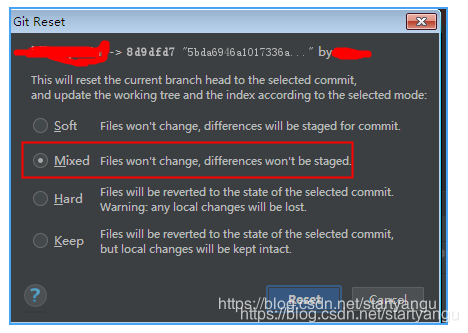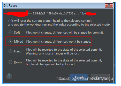 在弹框中选择mixed选项,这个选项会不修改我们在本地已经修改的问题,并且不会把我们,改变的文件放到暂存区,然后我们在强制提交,这个时候,我们本地和远程的提交就都被删除了