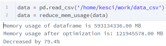 可以看到原来700mb的数据经过处理后仅占用100mb内存,内存降低了近80%。其理论可以发现将原来float64精度降为32,这种做法极大的节省了内存空间使用,但是这种方法在结构化问题中运用很不错,对于cv的化,这种做法可能对图像精度有一定影响,当然如果是混精度训练的化,也可能会有较大帮助。