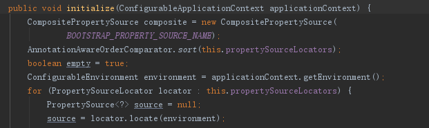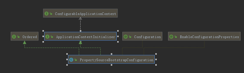 其次,PropertySourceBootstrapConfiguration 实现 ApplicationContextInitializer 接口类,其作用是在程序启动时,调用initialize方法进行相关初始化工作,也就是接下来要讲的 ConfigServer 的客户端解析配置文件的核心流程。