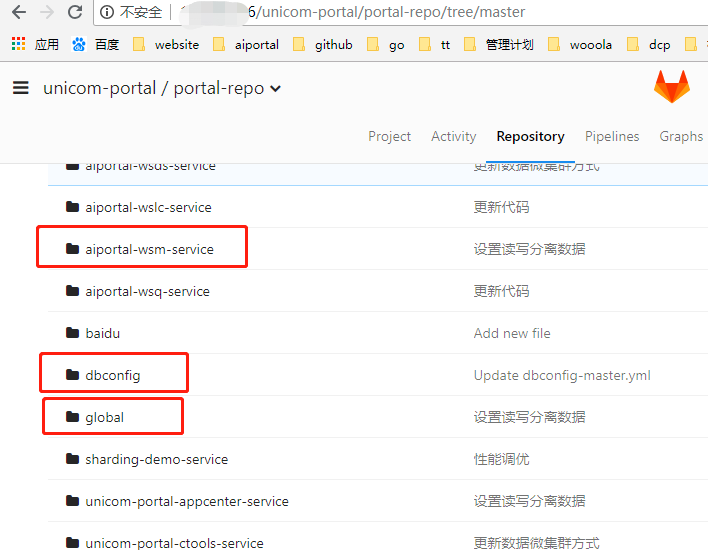 Gitlab 配置文件:aiportal-wsm-service、globa、,dbconfig 等yml文件