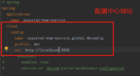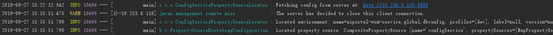 b.c.PropertySourceBootstrapConfiguration : Located property source: CompositePropertySource [name='configService', propertySources=[MapPropertySource [name='http://10.236.0.96/unicom-portal/portal-repo.git/dbconfig/dbconfig-dev.yml'], MapPropertySource [name='http://10.236.0.96/unicom-portal/portal-repo.git/global/global-dev.yml'], MapPropertySource [name='http://10.236.0.96/unicom-portal/portal-repo.git/aiportal-wsm-service/aiportal-wsm-service-dev.yml']]]