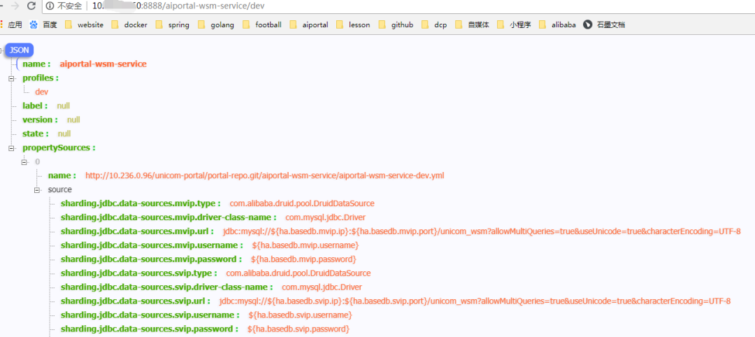 如果想在线查看某个服务的配置属性,比如 aiportal-wsm-service 微服务配置属性,在浏览器输入http://localhost:8888/aiportal-wsm-service/dev