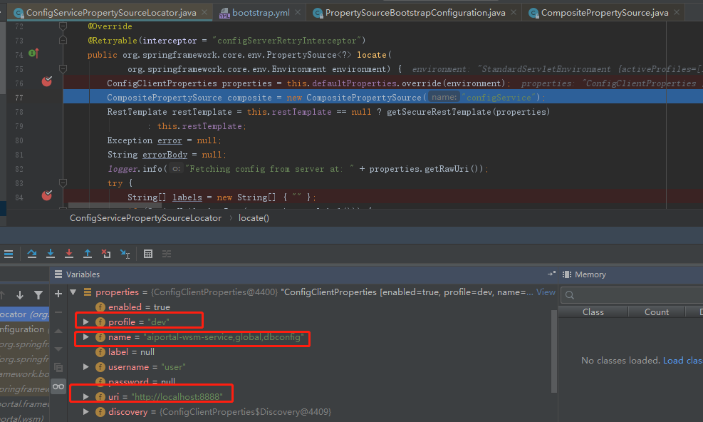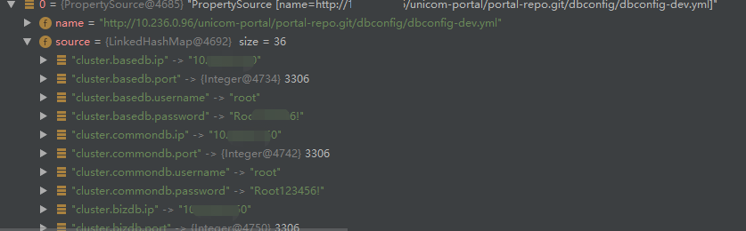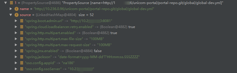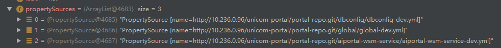 通过 debug 调试信息,发现成功拉取到 dbconfig-dev.yml、global-dev.yml、aiportal-wsm-service.yml 等配置文件,其中每个配置文件的属性都存放在一个PropertySource 类的 source 成员属性中,