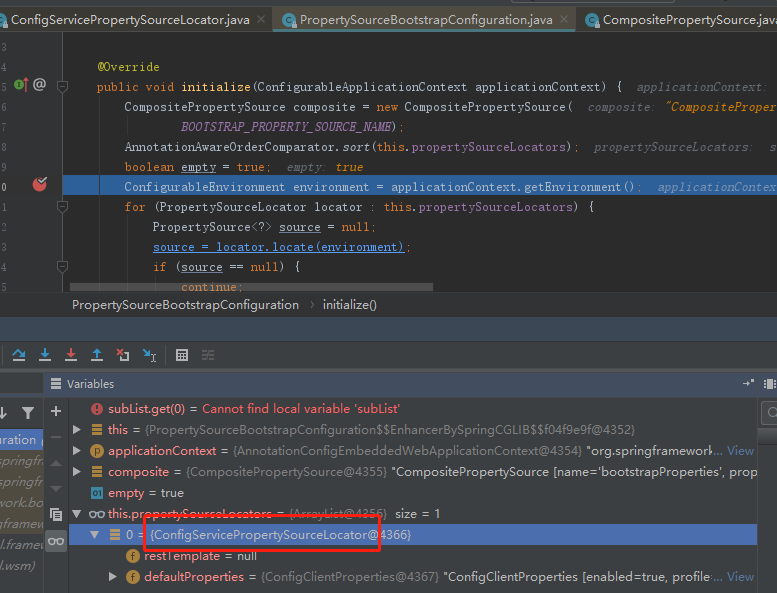 通过 debug 调试 PropertySourceBootstrapConfiguration 的 initialize 方法,通过Debugger 的 Variables 属性窗口