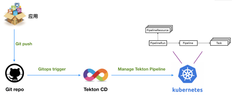 - Tekton CD (一个 K8s Operator) 会监听到相应的改动,根据不同条件生成不同的 Tekton Pipelines;