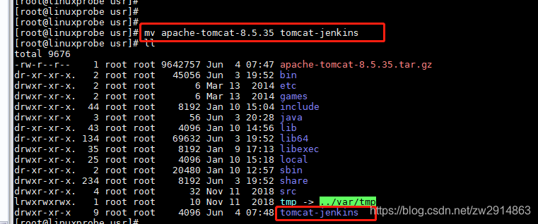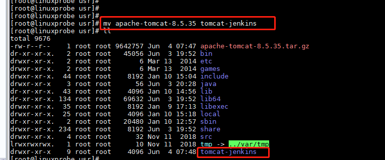 执行:mv apache-tomcat-8.5.35 tomcat-jenkins