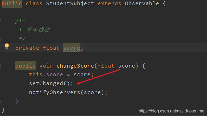 - 聪明的方案:采用观察者模式,当被观察者的成绩发生改变时,自动的通知其他的观察者