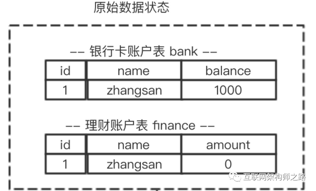 假设有两个表 bank和finance,表中原始数据如图所示,当进行插入,删除以及更新操作时生成的undo log如下面图所示:
