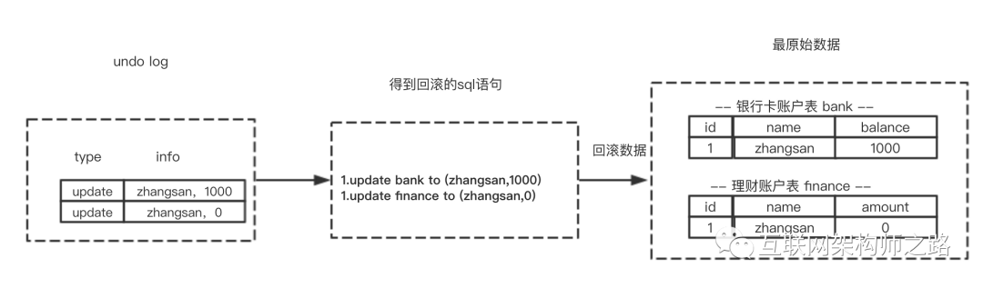 为了做到同时成功或者失败,当系统发生错误或者执行rollback操作时,需要根据undo log 进行回滚。