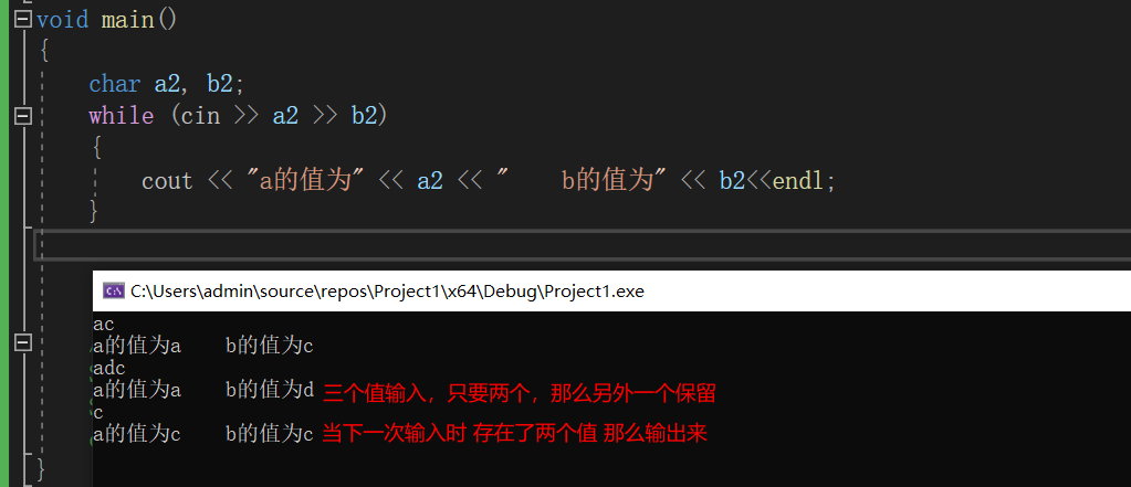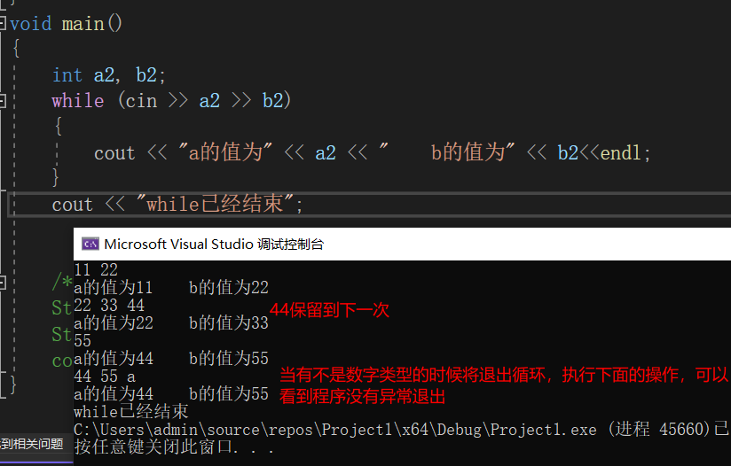 可以看到连续输入能够简化代码,如果想清空上次遗留的输入,可以通过cin.clear()