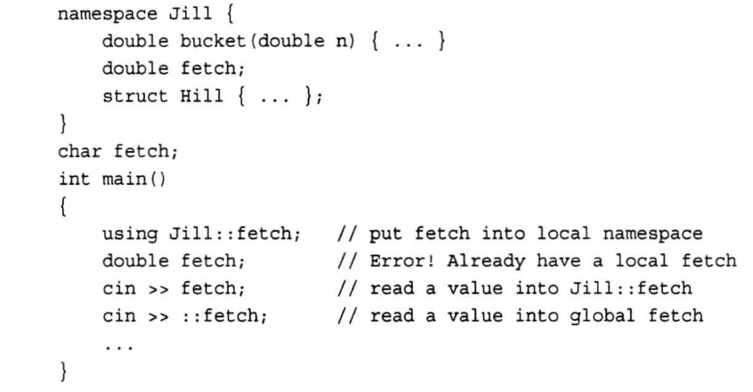 名称空间旨在让编写大型程序时以及组合多个厂商的代码组合时更加容易,就比如两个厂商都有wand()函数,这样使用的时候,编译器不知道用哪一个版本,因此名称空间可以指出想使用哪个厂商的产品。