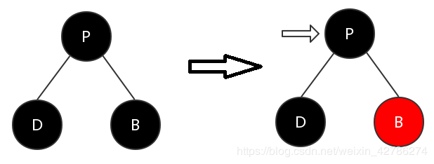 这种情况下,为了在删除节点 D 后使以 P 为根节点的子树能满足红黑树特性5,将兄弟节点 B 染成红色。但是这样操作后,以 P 为根节点的子树的黑色节点深度变小了。所以需要继续调整。