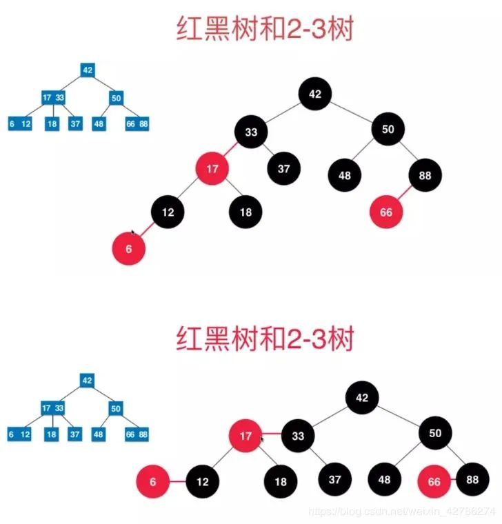 从上面可以看到,把红色节点放到与父亲齐平,就是2-3树中的一个2-3节点。