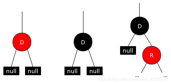 情况3:用右子节点 R 占据待删除节点 D,再将其染成黑色即可,不违反红黑树特性。因为左边本来就是空了,其实右子树下即使有多少个黑色节点,也不会影响整体特性。