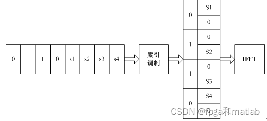 假设索引比特信息为0,1,1,0,其中0表示激活第一个子载波被激活发送,1表示的是第二个子载波被激活发送,发送数据比特为S1,S2,S3以及S4,那么通过索引调制之后,我们可以看到,当索引比特为0的时候,系统将发送数据为S-0,而当索引比特为1的时候,系统将发送0-S数据。