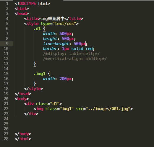 想要将img在div内实现垂直居中的话可以使用display:table-cell;+ vertical-align:middle;就可以了。如果使用父元素行高的话,实现的垂直居中会导致img的底部在容器的中线上而已,如下: