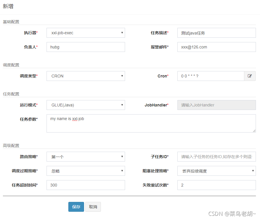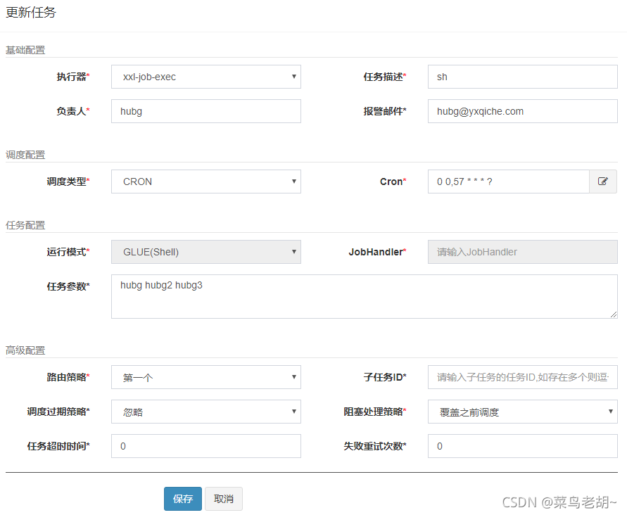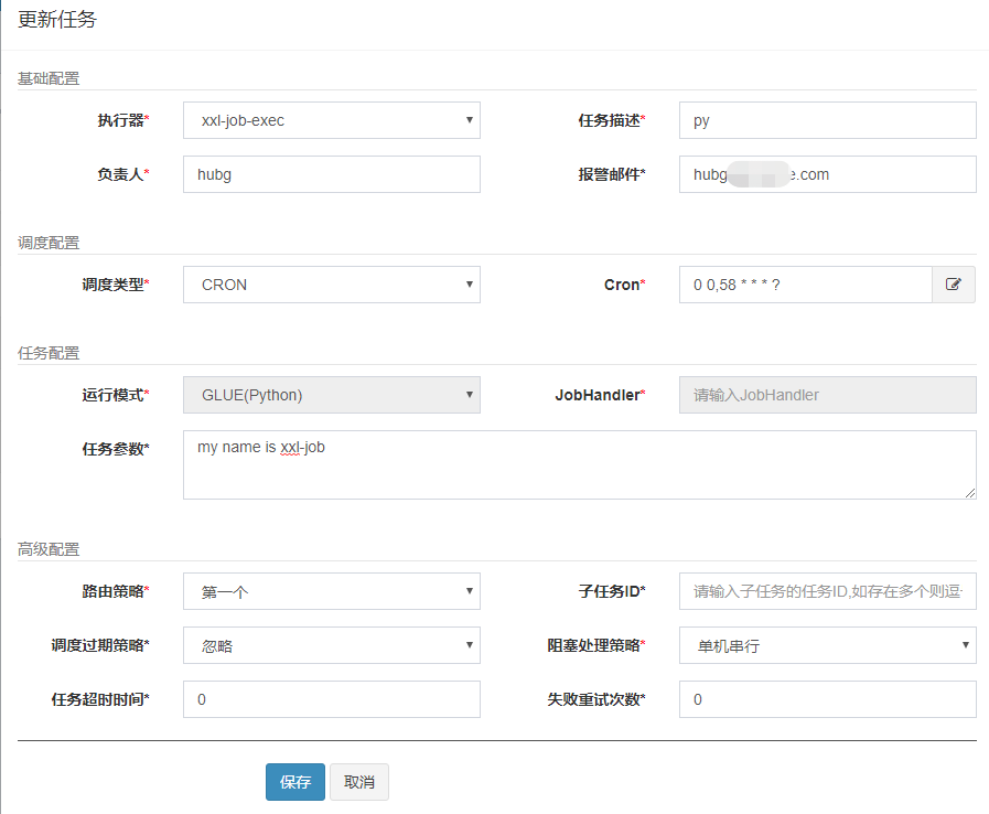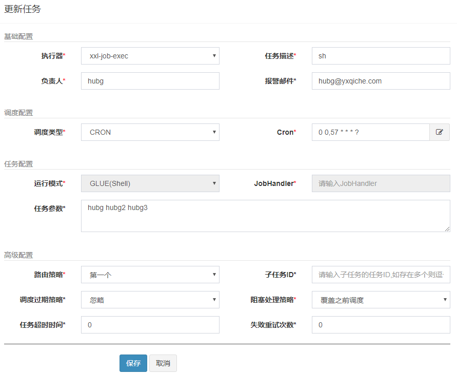 - 报警邮件:任务调度失败时邮件通知的邮箱地址,支持配置多邮箱地址,配置多个邮箱地址时用逗号分隔;