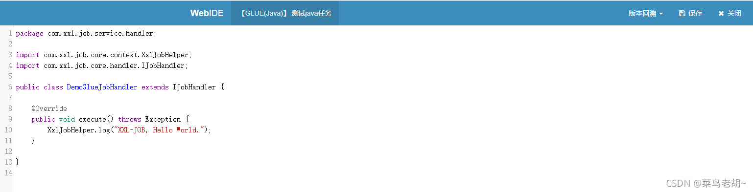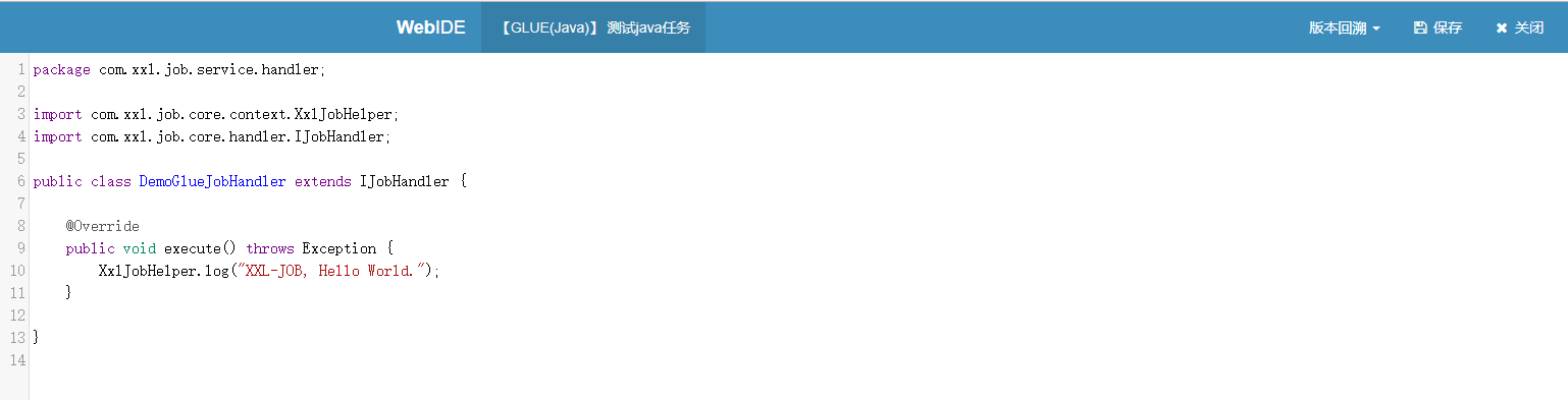 GLUE模式(Java):任务以源码方式维护在调度中心;该模式的任务实际上是一段继承自IJobHandler的Java类代码并 "groovy" 源码方式维护,它在执行器项目中运行,可使用@Resource/@Autowire注入执行器里中的其他服务;