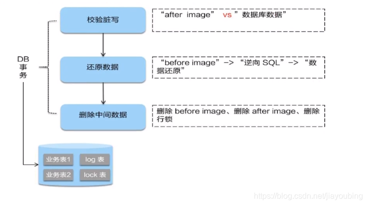 回滚方式就是用Before image 还原业务数据;但是在还原前会验证数据是否有脏读,对比当前数据和After image是否一致,如果完全一致,表示没有脏读,可以还原业务,如果不一致就表示有脏读,就需要人工干预处理