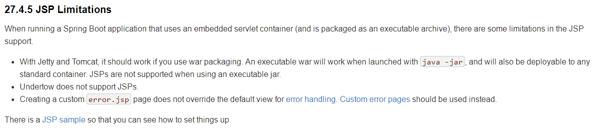 - 对于Jetty和Tomcat,如果使用war包装,它应该可以工作。 与java -jar一起启动时,可执行的war将起作用,并且还将可部署到任何标准容器中。 使用可执行jar时,不支持JSP。