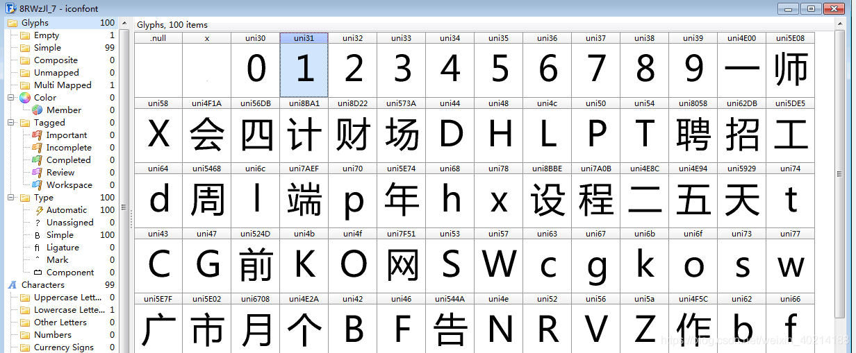 将图中url里面的内容复制,在浏览器新标签页面打开,会直接下载一个文件。使用FontCreator字体查看工具,可以看到隐藏字符都有一个对应的编码