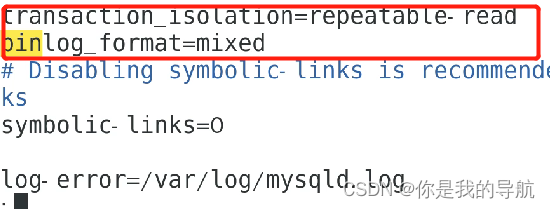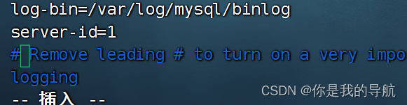 log-bin=/var/log/mysql/binlog 指定bin/log的位置,写一个路径,放在/var/lib/mysql/里面,指定一个名字叫binlog。不用主动的结尾。还得写一个server id,从1开始写,只要多个服务器不一样就行,server-id=1 //mysql 5.7必须要写,5.5不用