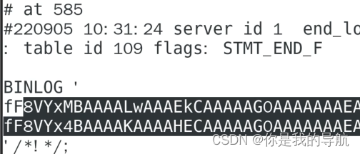 binlog日志是不能拿vim看的,想看它的内容就用mysqlbinlog +文件名字 ,里面的/*!开头的全部都是注释(不管什么样的编程语言,只要不是正常的,基本上除了注释也就没有其他的东西) 结尾是*/。