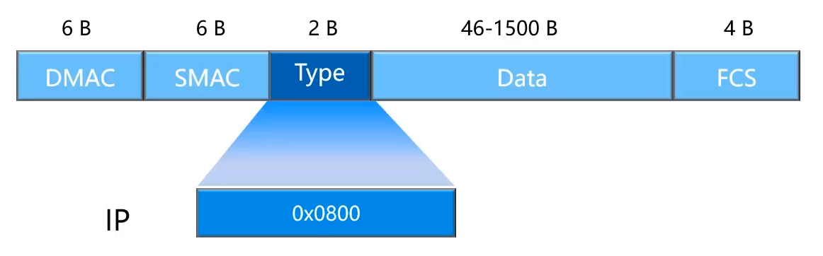 - 以太网帧中的Type字段值为0x0800,表示该帧的网络层协议为IP协议