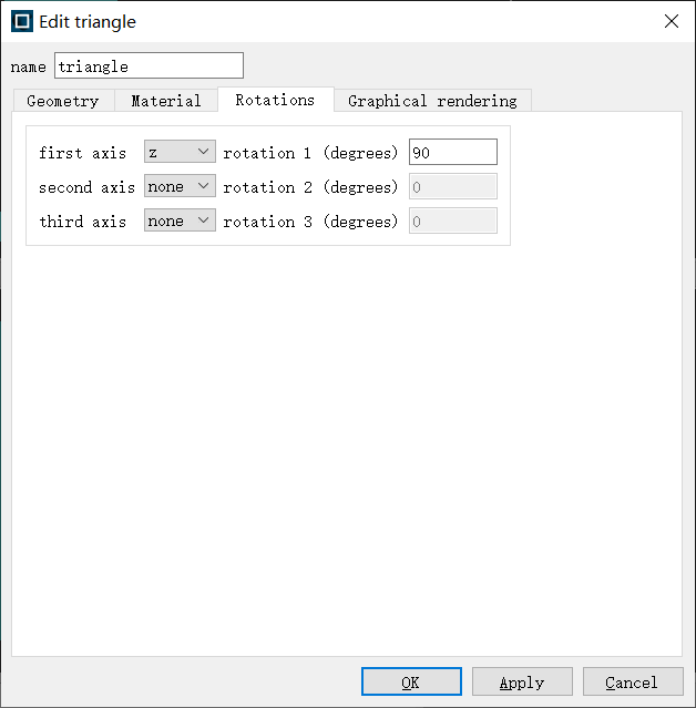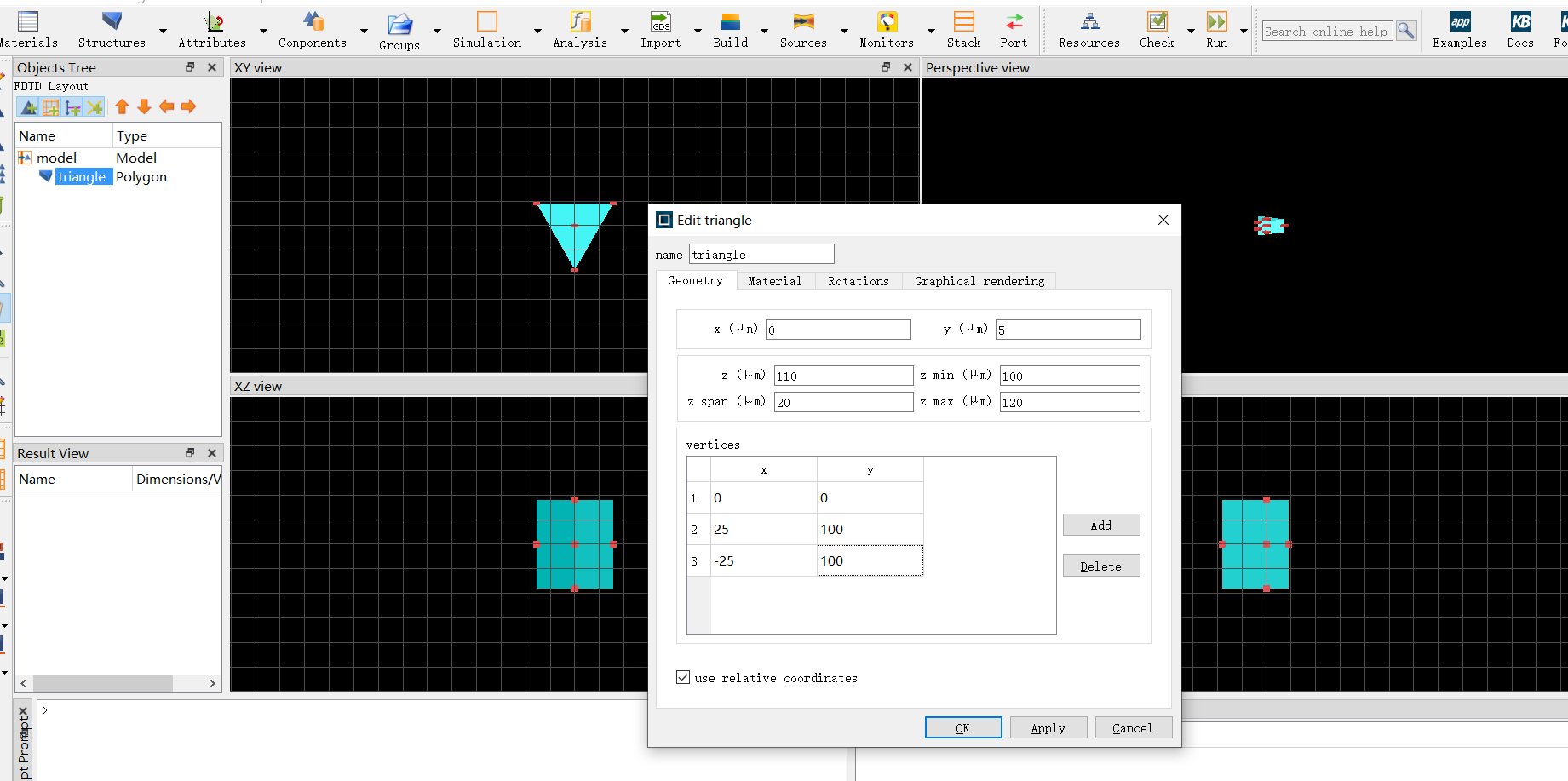 三角形需要先定义三角形的三个顶点坐标。多边形(polygon)也同样需要先设定各个端点的坐标。其他结构需要设定的参数详见编辑界面。如果遇到无法通过基本结构建立的图形,则使用Custom define设置特殊的结构。