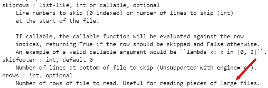 skiprows + nrows,前者用于控制跳过多少行记录,后者用于控制读取行数,skiprows默认值为0,nrows缺省读取所有行数,这也是最常用的方式。但合理的设置两个参数,可以实现循环读取特定范围的记录