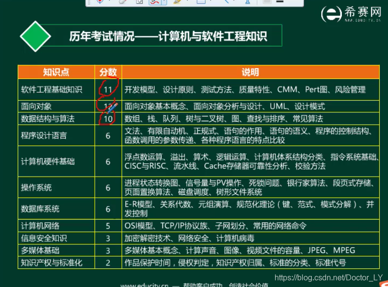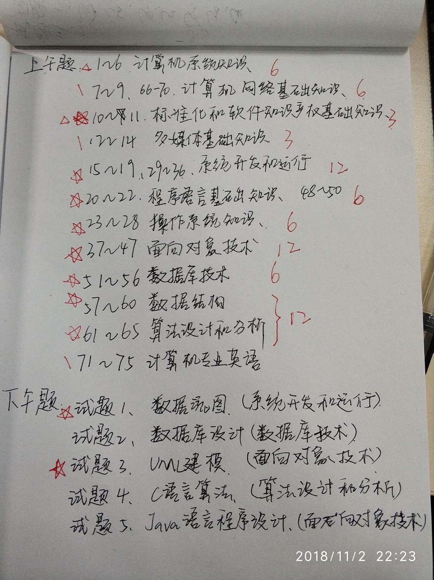 根据每一章占的分比,合理安排时间来学习。比如软件工程,占的分数很多,我就花了很多精力时间在这个上面,知识产权没接触过分值又低,我只是在考试前几天做了题,稍微看了一下。在学习过程中,其实有很多需要记得东西,可以根据自己习惯,来想一些比较容易记住的方式来记住。