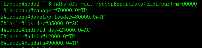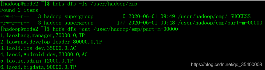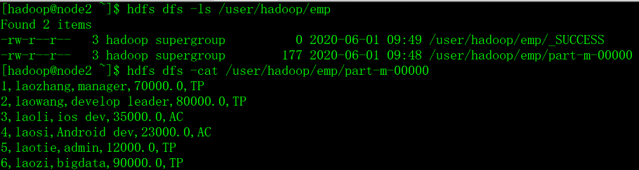 (6,'laozi','bigdata',90000,'TP');sqoop import --connect jdbc:mysql://node2:3306/userdb --username root --password 123456 --table emp --m 1没有指定hdfs目录,自动导入到当前用户目录,并且字段之间默认的分隔符是 ,逗号