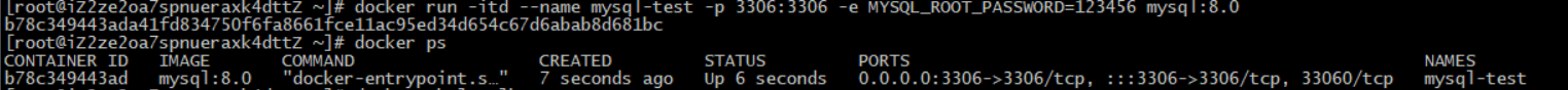 3.docker run -itd --name mysql-test -p 3306:3306 -e MYSQL_ROOT_PASSWORD=123456 mysql:8.0