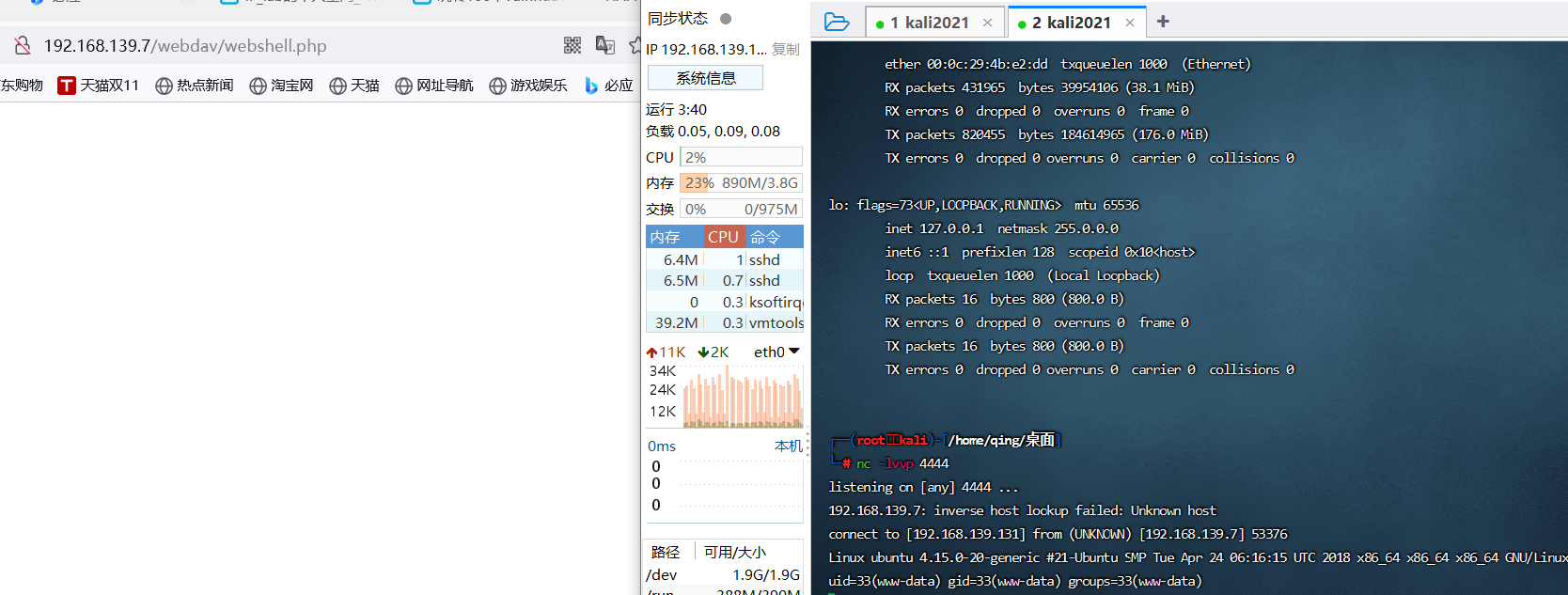 11.上传反向连接的木马,在本地进行监听,然后通过浏览器访问木马与本地连接,
