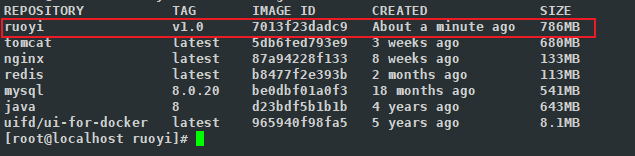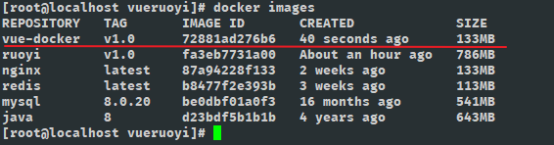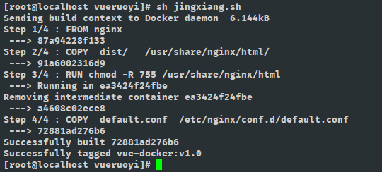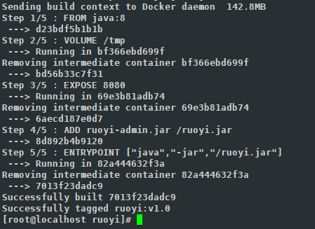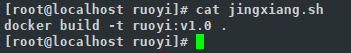 docker build -t ruoyi:v1.0 .其中 ruoyi是你自定义的名字, 也就是镜像的名字 后面的:v1.0 是指定的镜像版本 若不写 则默认为:laster 最新版本