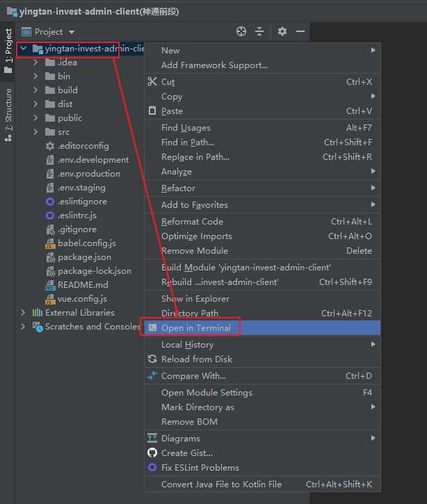 选择前段项目, 然后在控制台打开 输入指令