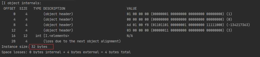 public class Person { static int[] nums = {1, 2, 3}; }开启压缩普通对象指针时,对象大小:(8+8)+12+4=32字节,补齐了4字节。