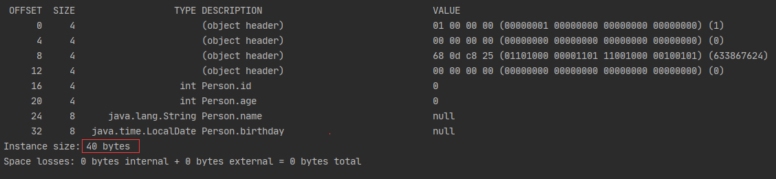 public class Person { private int id; private String name; private int age; private LocalDate birthday; }开启压缩普通对象指针时,对象大小:(8+4)+(4+4+4+4)+4=32字节,补齐了4字节。