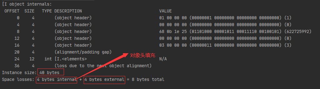 关闭压缩普通对象指针时,对象大小:(8+8+4+4)+12+4=40字节,补齐了8字节(对象头填充4字节:数组对象会有对象头对象填充;nums对象填充4字节)。