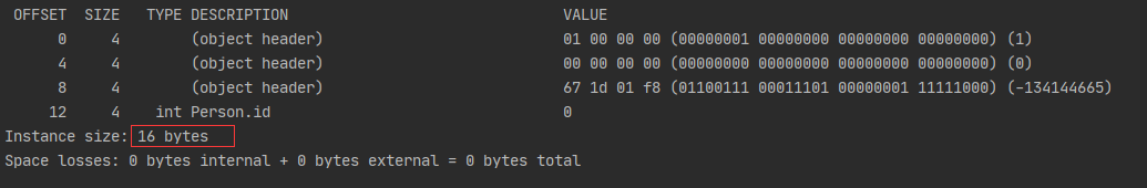 /** * 测试代码,以下不重复贴,参照此代码进行测试 */ @Test public void testClassSize(){ Person person = new Person(); System.out.println(ClassLayout.parseInstance(person).toPrintable()); }打印结果(默认开启压缩):