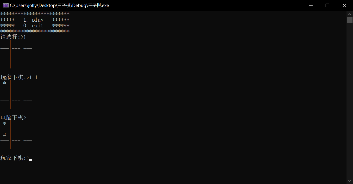 然后一个简易版三子棋就完成了!!后期可以完善代码将人工智障转化为人工智能(下棋高手),利用这个模板还可以完成五子棋的制作。