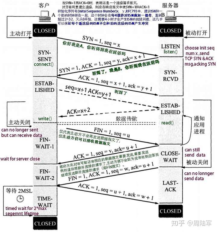 A:好的我关了,你也关吧。第一次FIN表明主动方停止发送数据,FIN_WAIT1表明在等待被动方回应。被动方进入CLOSE_WAIT状态表示还有数据要处理或发送,且主动方此时并未丧失接收数据能力,因此继续接受,进入FIN_WAIT2。当被动方发送完毕后,发送FIN告知被动方停止发送。主动方接收到后表示ojbk,你先关吧。注意,有人认为被动方发送FIN后自己就可以关了,但是如果主动方没有接收到消息,那主动方将一直傻傻的等待。又有人认为,那让被动方有等待2MSL的策略不就行了?确保主动方一定能接收到。但是你想确保主动方能接收到,就必须要接收到主动方的ACK,因此必然要四次握手。