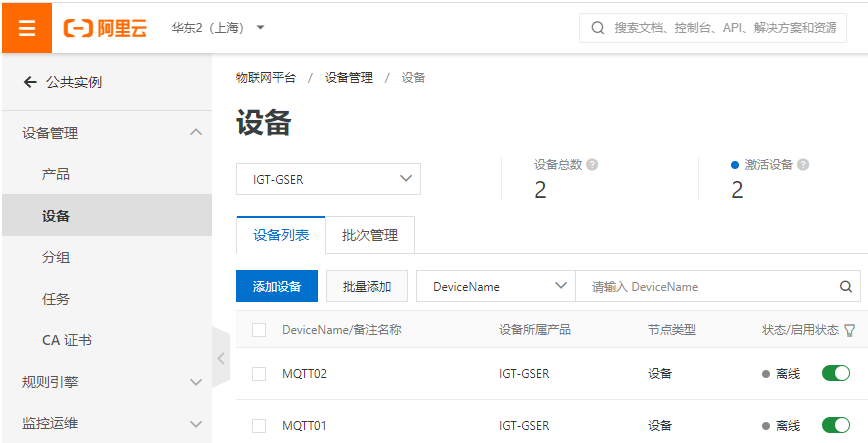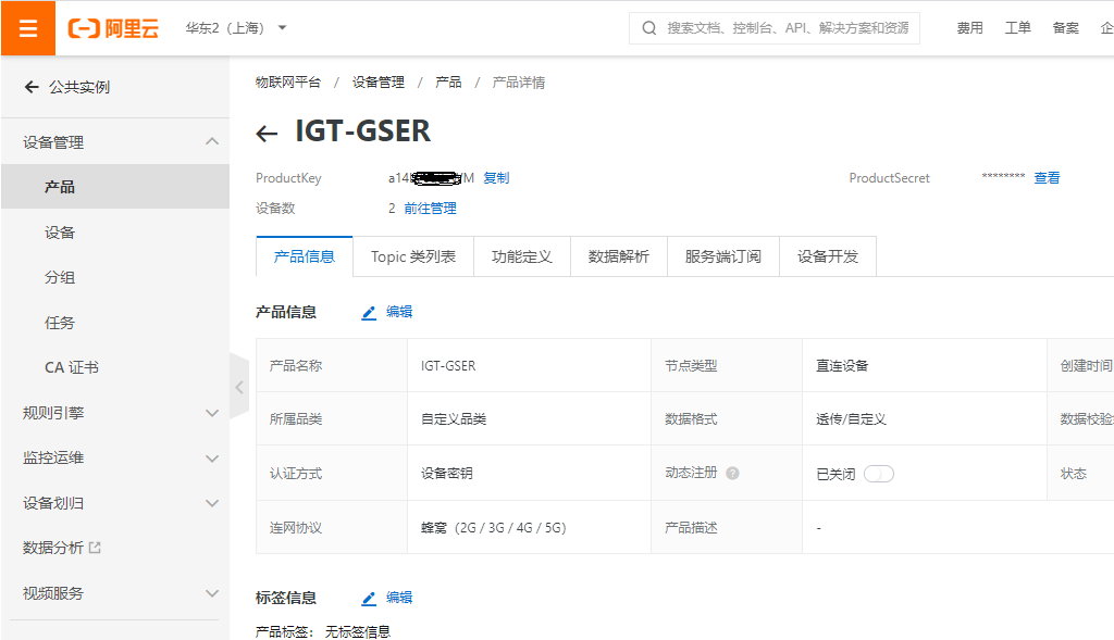 首先要在阿里云上注册,然后进入控制台创建产品,阿里云平台有详细的开发文档,以下是创建好的IGT-GSER产品: