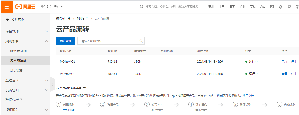 最后要创建两个转发规则,实现MQTT01订阅MQTT02发布的数据,MQTT02订阅MQTT01发布的数据,创建好的规则如下图: