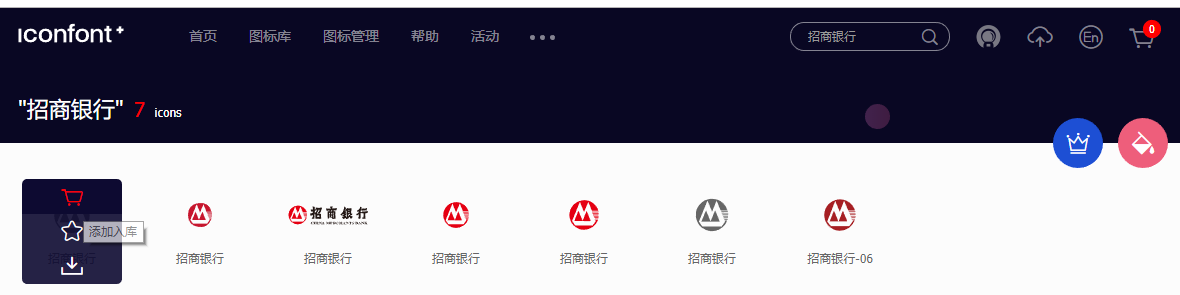 - 打开https://www.iconfont.cn/,使用微博或github登录在搜索框中搜索“招商银行”或cmb,出现以下结果